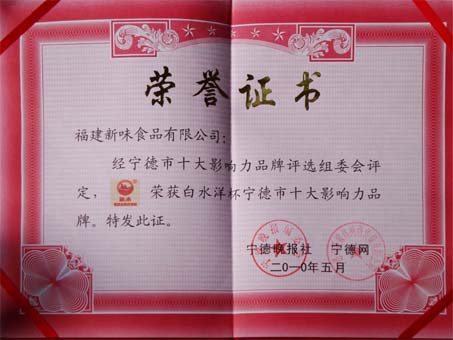 熱烈祝賀“新味”品牌被評為“寧德十大影響力品牌”榮譽(yù)稱號,“白水洋”杯“寧德十大影響力品牌”經(jīng)過網(wǎng)絡(luò)投票、專家評比,品牌美譽(yù)度調(diào)查,品牌影響力調(diào)查等層層篩選:“新味”品牌因其產(chǎn)品獨(dú)特,帶動(dòng)面廣,影響力大而名列其中。